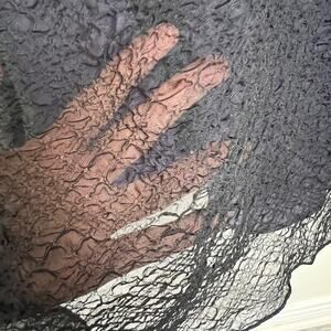 Sheer, black gauzy fabric over purple liner. Empire waist with ribbon detail and ribbon flower. Side zip. A-Line skirt.