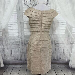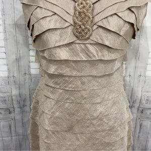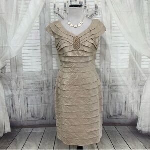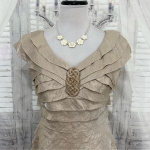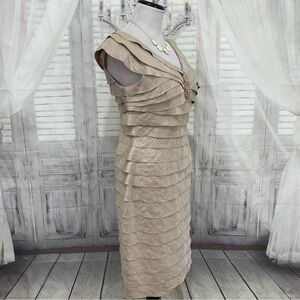 London Times Size 8 Cocktail Dress Tan Gold Layered Ruffle V Neck Sheath NWT