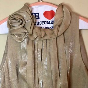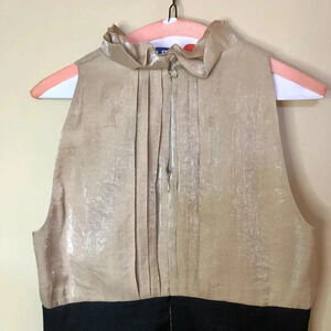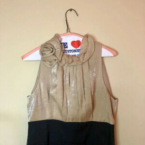 It's getting to be wedding invitation time! Cute but classic two-tone black and soft beige, Rayon & Polyester dress with cutout sleeveless. Pleated front and back. High ruffle neck with rosette on the side for an extra feminine touch! Back zipper goes up just short of the two button neck closure, leaving a small opening to add extra style interest! Size 10. Very very cute. Worn one time to a wedding and then dry cleaned. This is truly in excellent used condition.