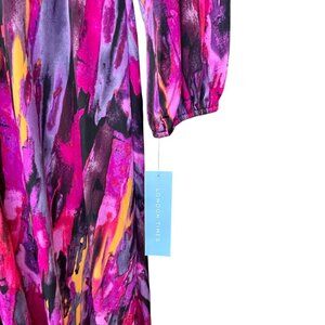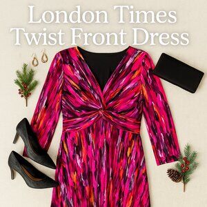Turn heads in this stunning London Times Twist Front Asymmetric Hem Dress in vibrant pink, purple, orange, and black abstract print. This brand new with tags dress combines bold color with timeless sophistication. The twist-front bodice flatters the waist, while the asymmetric hemline adds graceful movement and modern flair. Crafted from a comfortable stretch knit fabric, this dress drapes beautifully and feels amazing to wear. Perfect for weddings, cocktail parties, date nights, or holiday gatherings.