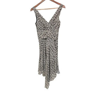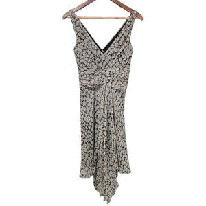 London Times V-Neck Sleeveless Silk Dress in Stone. Size 4. Features surplice V-neck, sleeveless, ruched empire waist, handkerchief hem, stone print, side slit, hidden side zipper closure, lined, fit & flare silhouette, and midi length. Style LT2218. 100% Silk. NWT / New with tags.