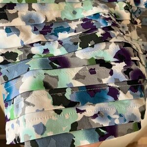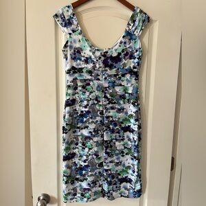 EUC excellent condition. Minor flaw on INSIDE fabric under shoulder. See photos. Otherwise in excellent condition! Beautiful blues & greens floral pattern. Polyester & spandex blend. Stretch. Pleated straps & bodice. V wrap neckline. Back zipper. Measurements in photos. Women’s size 8. Smoke free home