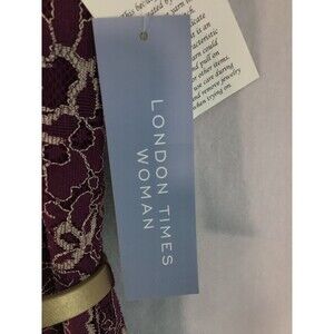 This London Times Women's dress in size 20W is a stunning wine maroon floral patterned gown made from nylon and rayon lace fabric. The sleeveless design with a V-neckline and zip closure makes it perfect for special occasions like weddings, parties, or formal events. The knee-length fit and flare style with belted accents and embroidered details adds an elegant touch to the dress. It is lined and features a gold design, making it a classy and timeless choice for any season. Made in the Philippines, this dress exudes a boho chic and whimsigoth vibe with a hint of art deco flair.