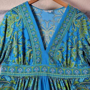 London Times Womens 10 Blue Green Paisley Babydoll Y2K Boho Retro Midi Dress