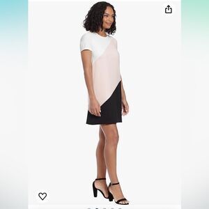 Jewel neck, short sleeves, color clock A-line body, and an above the knee skirt length.