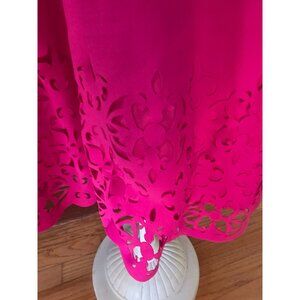 This elegant dress by London Times, crafted in vibrant pink fabric, features an intricate laser-cut hem for a sophisticated touch. Ideal for warmer weather, its midi length offers a flattering silhouette. With short sleeves and a comfortable fit, this dress is suited for various formal occasions.