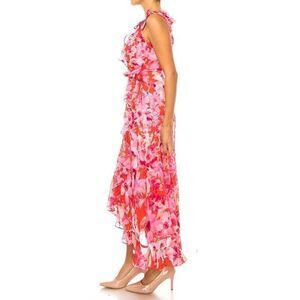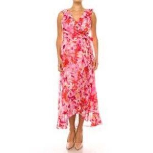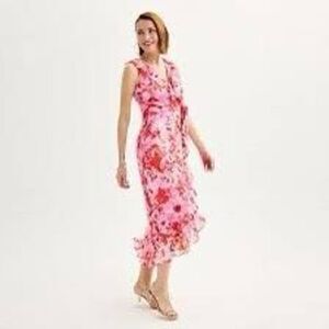 London Times Women’s Size 10 Tiered Apron Midi Wrap Dress Pink Floral Ruffle NWT
