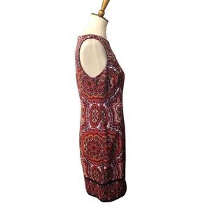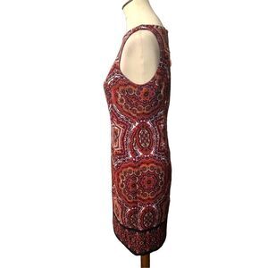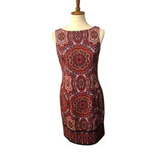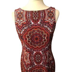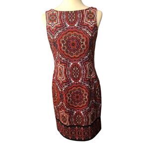 London Times earth tones medallion prints stretch sheath dress Size 4. Hidden back zipper and hook closure, sleeveless, high neckline.