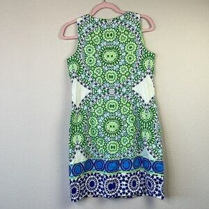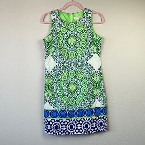 Intricate detailed patterns all over dress. Blue and green. Perfect event dress, date night, business etc. very versatile. great condition.