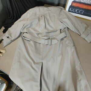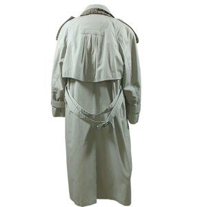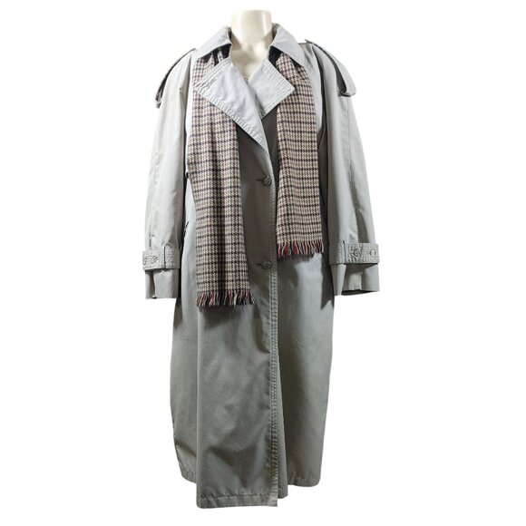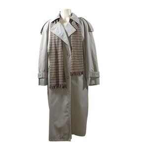 A timeless trench coat by London Towne featuring a plaid liner and belt. Classic beige color with a removable scarf, perfect for vintage lovers.