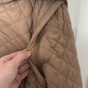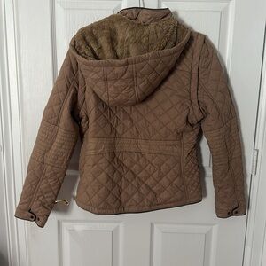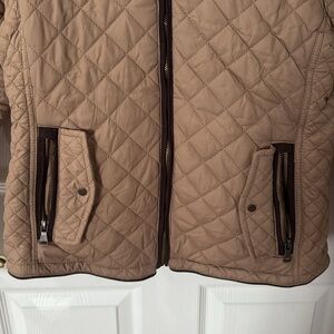 Elegant beige quilted jacket. Features a stylish design and comfortable fit. Multiple pockets. Removable hood and sleeves converts to vest. Faux fur interior. Excellent condition. Smoke free home.