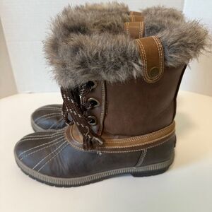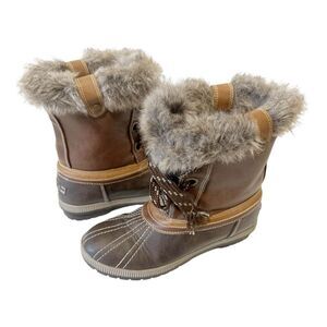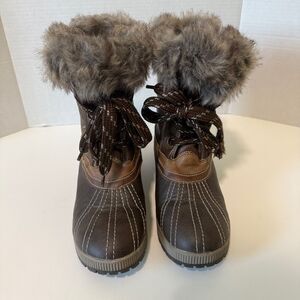 London Fog Milly Women's Brown Faux Leather Waterproof Faux Fur Winter Duck Boots. Size 10.