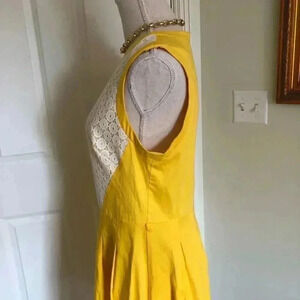 London Style Collection adorable retro/vintage eyelet dress. I wish this one fit me. Sunshine yellow and white embroidered fit and flair sleeveless dress size 12. The dress does have a bit of stretch:) In excellent used condition. It is missing the bet but I would put a designer belt with it anyways:)