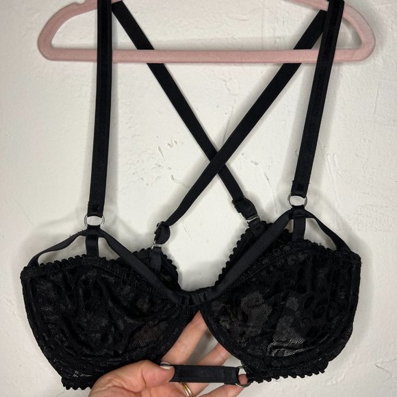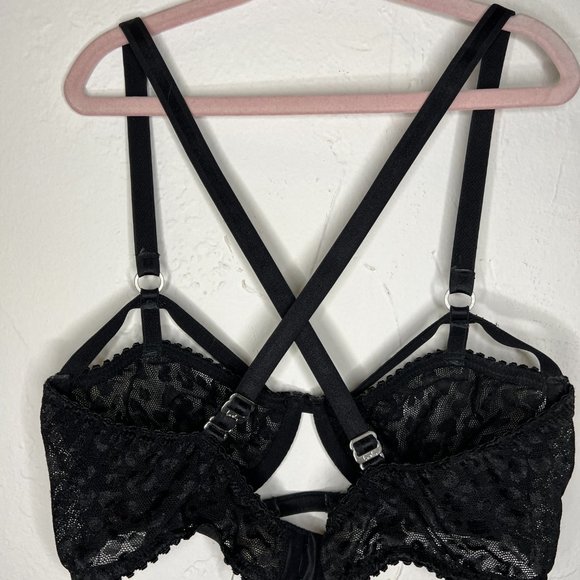 Gently worn in great preowned condition. Lonely lingerie black lace bra with black satin elastic trim and silver rings for cut-out cage look. Hooks and adjustable straps so it can be worn with straight straps or criss-cross as shown.