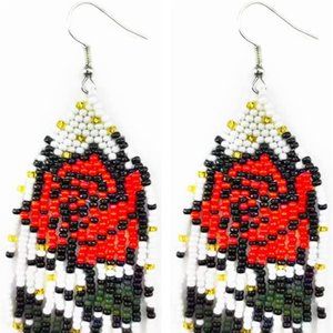 Approx 4.5" handcrafted rose dangle earrings in red , white , gold and black
