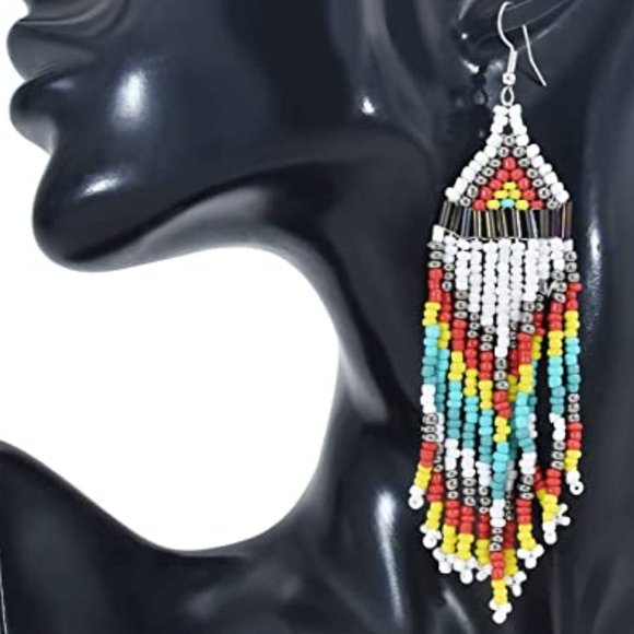 Approx 4.5" handcrafted dangle beaded fringe earrings in white pink turquoise yellow and red
