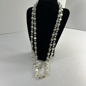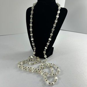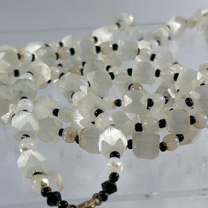 Long 56" Beaded Necklace White Faceted Beads Black Spacers Tunic Length with light signs of wear as pictured. Unsure what beads are made of but they are not gemstones.
