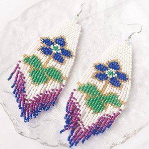 Approx 6" handcrafted flower dangle earrings in blue , white , purple , green , and gold