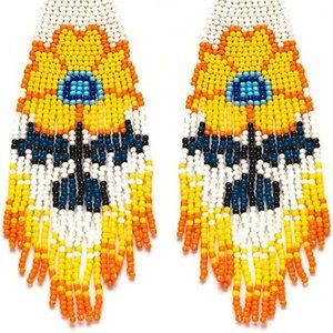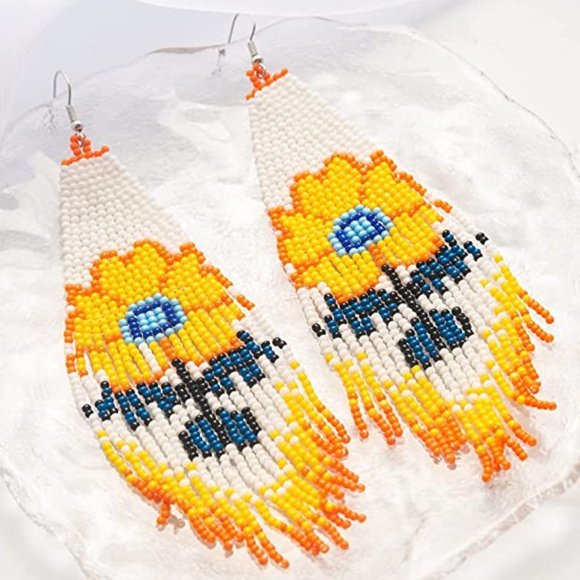 Approx 6" handcrafted flower dangle earrings in orange , white , black , blue and golden yellow