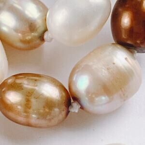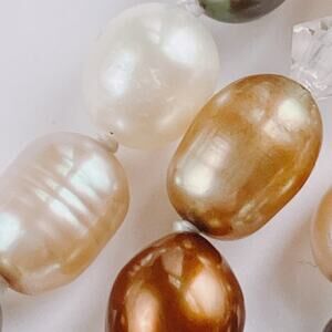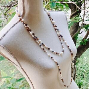 Features: Multicolor pearls in bronze, silver-gray, and ivory tones; faceted crystal spacers; no clasp; can be worn long or doubled; endless strand; knotted strand