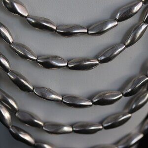 This necklace has black beads with silver nugget beads. It is adjustable between 23" to 28" in the back by pulling the two knots. Easily slips over head.