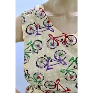 Long Bib Apron Bicycles on Yellow seersucker fabric Wrap style Pinafore M L