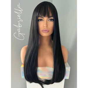 Long Black 24 inch Silky Straight Synthetic Wig with Bangs