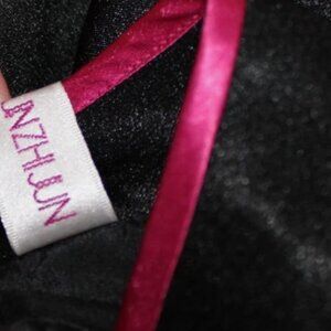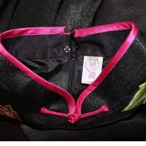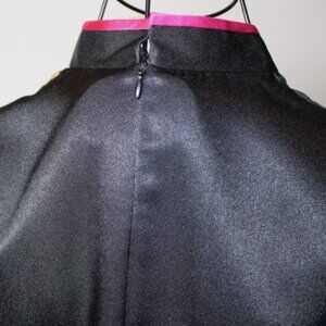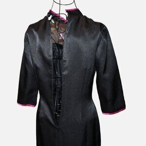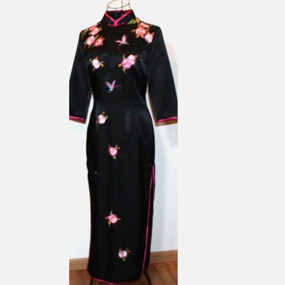 Long black back zip lined satin dress with pink accent trim & pink and green embroidered floral butterfly pattern. Mandarin collar, side slits, maker label says "Yunzhijun L" -- fits like extra small (bust is 34", waist is 28", hip is 34", length is 49", sleeve length is 16"). In excellent condition with no signs of wear.