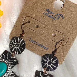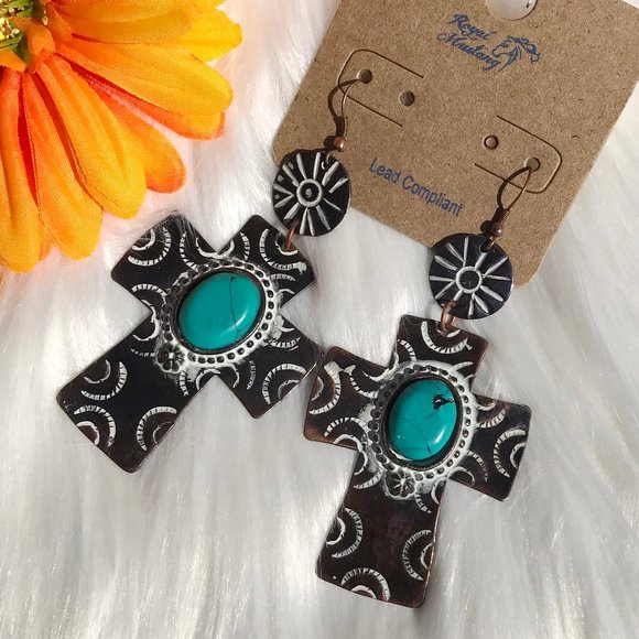 New! Long Boho Earrings Etched Cross Turquoise Dangles