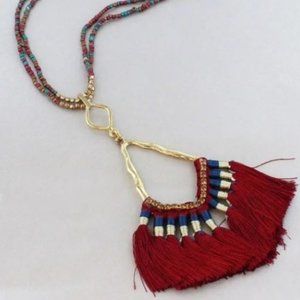 Long Burgundy & Gold Tone Fan Tassel Necklace