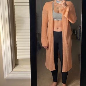 long, light cardigan. light pink, brand new never worn. slit sides, small pattern on sleeves