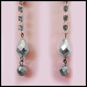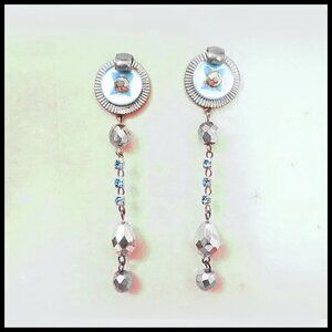Seriously like no other long postback drop earrings. My designs were an intricate process working through where to put WHAT vintage piece. All are one of a kind and recycled. Pastel blue thermoset (buttons!) and silver chain dangles. (See if they dust your shoulders) Surgical steel posts, disc clutches. Made with vintage Lucite "moonglow" thermoset buttons, silvertone base, silver (yes!) rhinestones, faceted glass beads with metallic silver coating, light blue rhinestone chain, EVERYTHING vintage but the postbacks. Lightweight, long and skinny. Will come in a jewelry gift box in one business day. (I started recycling vintage pieces in 1991 and quit years ago. I have made over 1000 pairs of earrings and this pair is number 962.) Selling price is just above original wholesale...