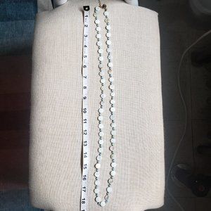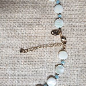 Pretty beaded necklace with flat round shell beads and small blue spacer beads. Excellent preowned condition with no signs of wear.