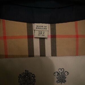 Sophisticated dark blue trench coat. Features iconic check lining. Timeless style for versatile wear.
