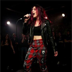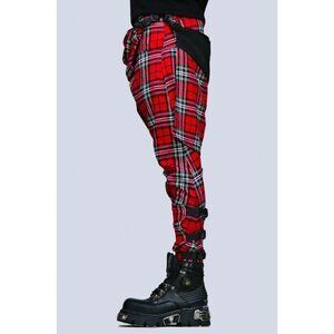★ Style: Red tartan clip pants w/ patch graphics & buckle straps
