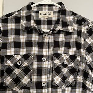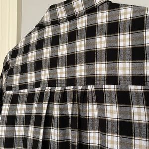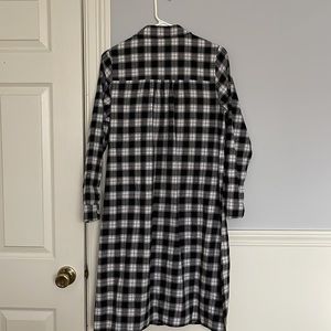 Long sleeve cotton shirt. Wear it open as a light jacket or closed as a shirt dress over leggings. Great for layering or when belted. Pleat detail on the back. In like-new condition.