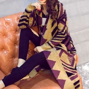 This amazing duster/cardigan is SO soft and cozy... it's tan, purple, looks incredible, and is one of the coziest/comfiest ones I own! I'm an XS/S/0-2 and 5'3 at 107lbs and it's not snug on me. It hits a little below mid calf, and it fits very similiar to how the one in the photo fits on the model. From the website StyleWe- no designer tags
