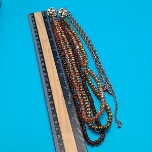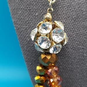 *Description: This is a topaz and bronze crystal bead necklace which is 37 inches in length and has two clear rhinestone beads on each side. The beads are attached to gold tone chain near your neck and then branch out into three strands of layered crystals. The necklace has a lobster clasp. This would be a great addition to your jewelry collection or make a great gift!
