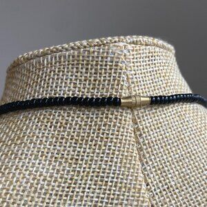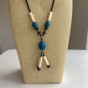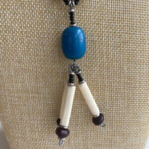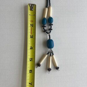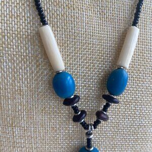 Cylindrical white/ivory beads, blue oval beads, black beads on black beaded strand