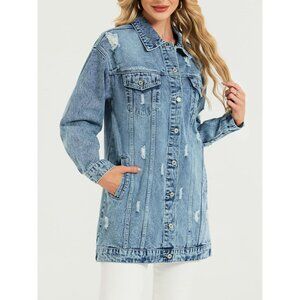 Features: This long, oversized denim jacket has a relaxed fit with a longer length that adds a chic, modern vibe. Detailed with ripping and distressing, it features a lapel collar, long sleeves, and multiple pockets—perfect for a streetwear-inspired look. Button-down front, above-knee length, versatile style.