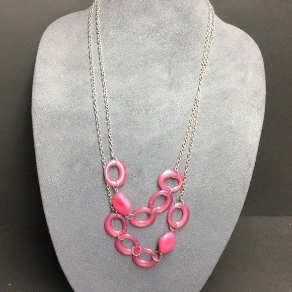 Long Double Strand Necklace Pink Abstract Bead Ring Silver Chain Retro Organic
