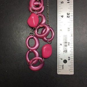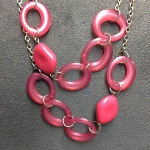 Long double strand necklace with pink abstract organic shaped beads and rings, silvertone chain!