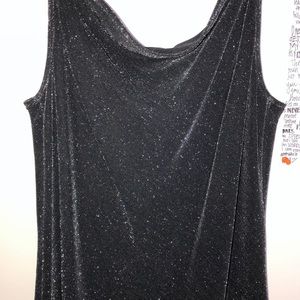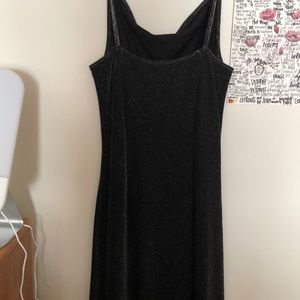 Long, black, cowl neck dress with silver sparkles throughout fabric