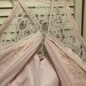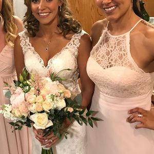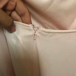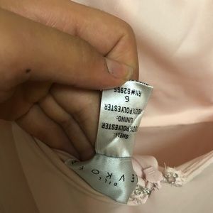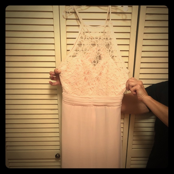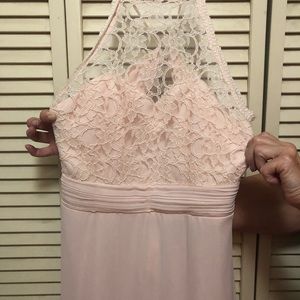 Was a bridesmaids dress. Only worn for a few hours and has been dry cleaned! Very nice fabric and quality. Since it is designer it was 250 :) but if my price is too high for you make an offer! :) super pretty. Long. Comfy! And the light pink could easily be fabric died into another color.