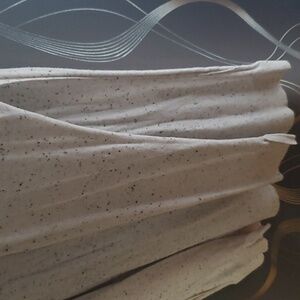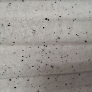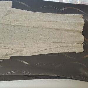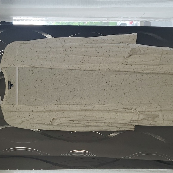 Express duster. Speckled, cream with black dots. Two pockets in the front and slits on both sides. No button or zipper closure. The duster is full length and lightweight.