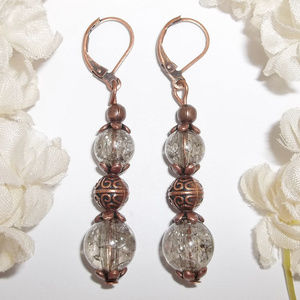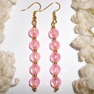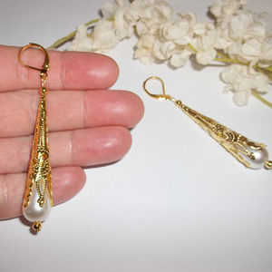 This NWT beaded costume jewelry earring set is handmade by me. Done with white faux freshwater acrylic pearls. The pair also have gold toned costume jewelry beads. The bead snugs into a thin metal hollow ornate design casing.The pair dangle & drop from lever backs for women's pierced ears. 2 3/4 inches tall & 3/8 inches wide. Each single earring weighs 1.9 grams. Lightweight! You will love the long glamorous length of these