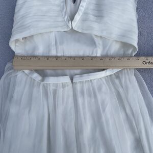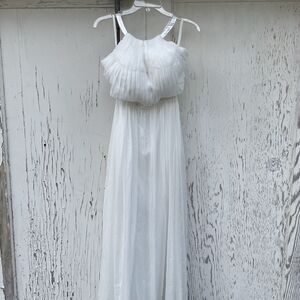 Long Evening Prom or Wedding Dress Women's Size 2 Sleeveless Halter Pure White Chiffon and Satin Gown. Measurements Taken Flat: Chest 28" Waist 27" Length Taken Hanging: Length 55" Perfect to wear to a formal, prom, evening out or a wedding!! In Excellent Per-Loved Condition / A small Rip on the Left Side Pictured otherwise no obvious defects. Please see photos for exact measurements.