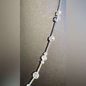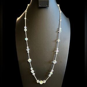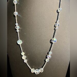 This is gorgeous and stunning. Much better in person. Clear AB crystal of varying sizes and clear seed beads make up this long necklace. Spring clasp in the back.