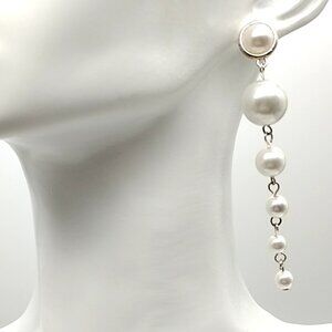 Long Faux Pearl Drop Dangle Earrings Silver Tone Chain Statement