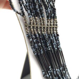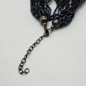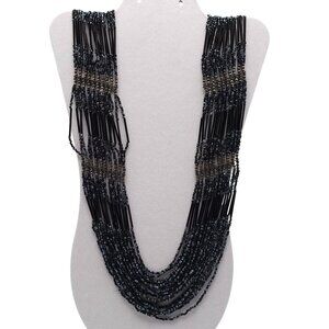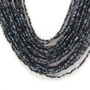 This intricately designed necklace features multiple strands of black beads paired with metal accents. Its adjustable chain ensures a comfortable fit.